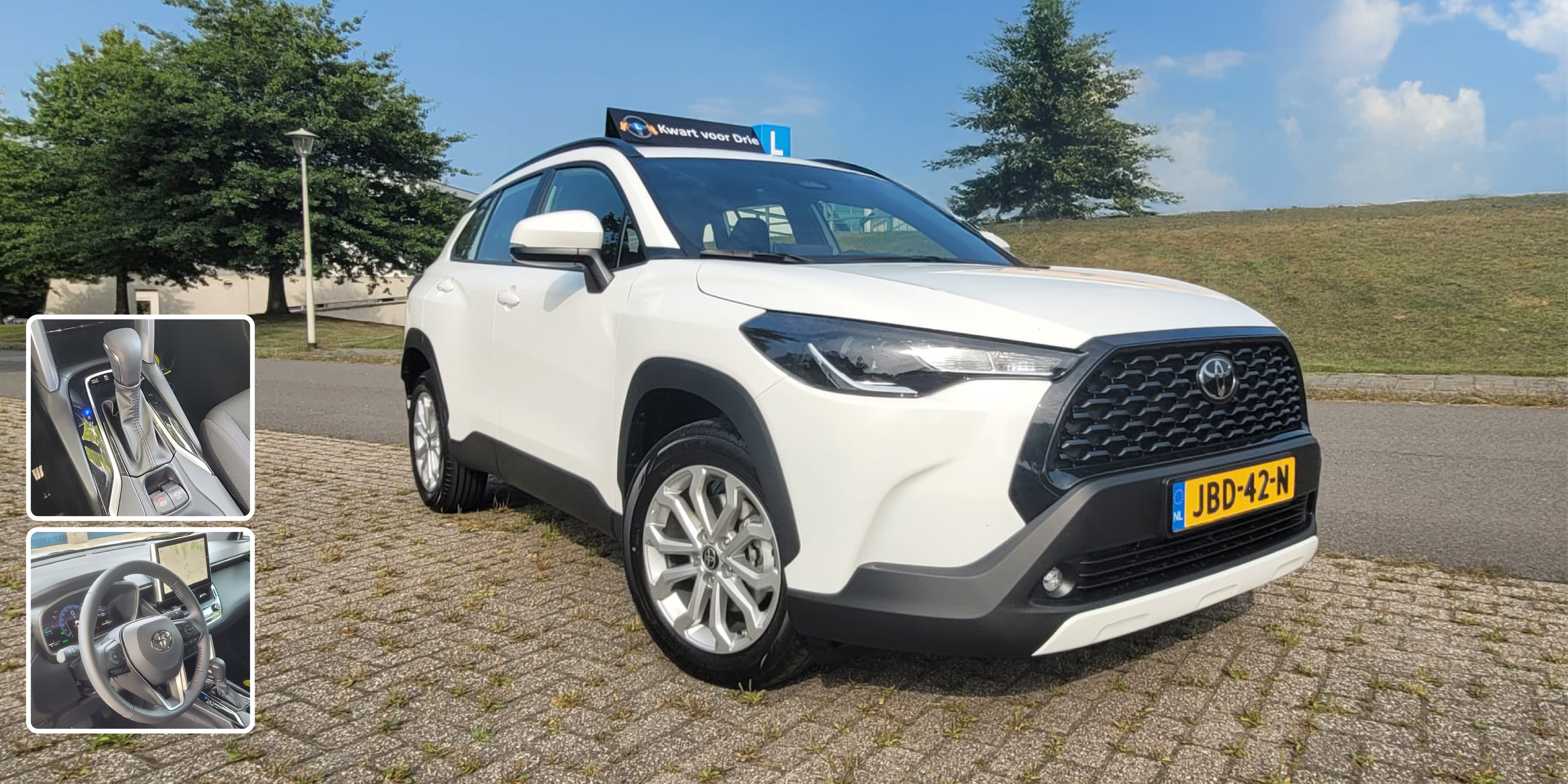 Bij Rijschool Kwart voor Drie krijg je les in een nieuwe Toyota Corolla Cross Hybride. En altijd met dezelfde erkende rij-instructeur.